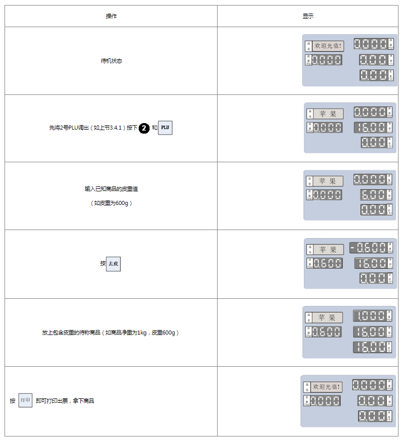 阅读本手册时,操作见表格最左列,表格其余列为实施最左列操作后条码打印计价秤各个窗口的显示内容;